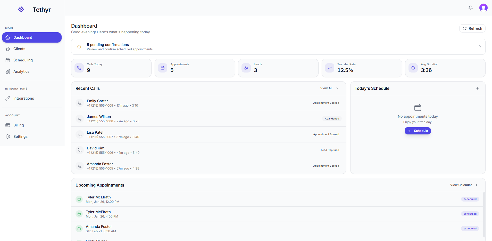 See every call, appointment, and lead in real time. Dark mode included.